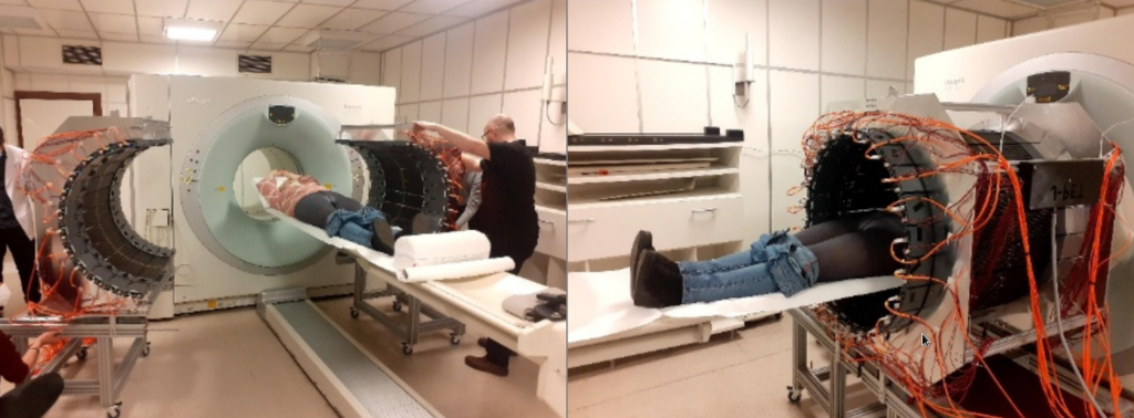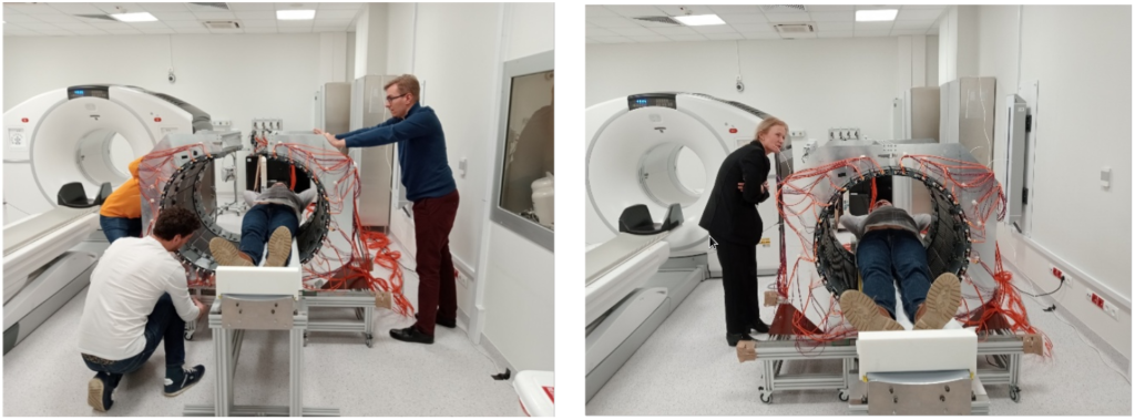 The research was performed at the Medical University of Warsaw, with studies conducted following routine procedures so as not to interfere with routine diagnostics and therapy. If a patient agreed to stay longer on the platform, we had about 10 to 15 minutes to install the J-PET tomograph around them and collect data.