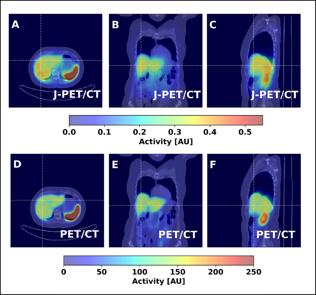 Fig. 6. Coronal, sagittal, and transversal images obtained from a patient injected with the [68Ga]Ga-DOTA-TATE pharmaceutical, comparing a 25-minute scan with GE Discovery MI Gen 2 PET/CT to a 16-minute scan with a J-PET. Images are from the public plenary lecture of Prof. Moskal at Japanese Society of Nuclear Medicine: [PL2] Jagiellonian PET: Democratizing access to positron emission tomography with low-cost, modular, lightweight, and portable PET scanners based on plastic scintillators | JSNM2025/JSNMT2025 | Confit