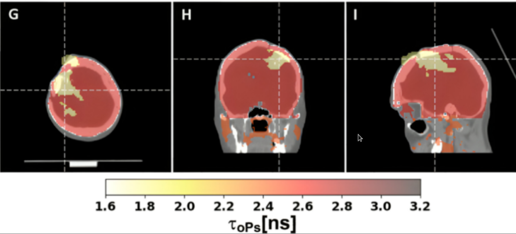 Fig. 4. This is the first ever positronium image of the human brain which was demonstrated using the J-PET scanner. Positronium images of a patient with glioblastoma, showing the difference in mean ortho-positronium lifetime (a new diagnostic parameter) between glioma and healthy brain. The figure is taken from the article published in Science Advances: https://www.science.org/doi/10.1126/sciadv.adp2840